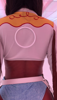 - Includes: fringe top, panty, chaps & belt